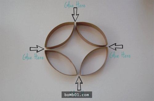 ▼再把捲筒芯稍微壓扁後,如圖中的方式排列,然後在箭頭處黏上膠水。