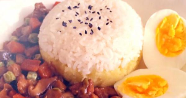 9. 拿一個小碗,碗底鋪一層米飯壓平,放入一層土豆泥壓平,上面再鋪一層米飯壓平。
