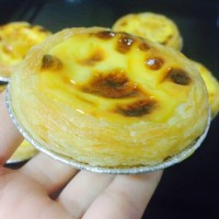 3. 過濾一次將撻液後倒入撻皮,(想吃黃桃味的可以切兩小塊水果罐頭的黃桃擦乾水分放入即可)上火210、下火230,30分鐘烤至表皮焦黃,冷卻後就可以享用啦