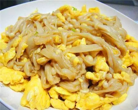 . 小貼士: 1、金針菇在鹽水中浸泡,是為了消除可能的細菌和異味; 2、炒雞蛋得用大火,雞蛋中加少量清水可以讓雞蛋更蓬鬆。