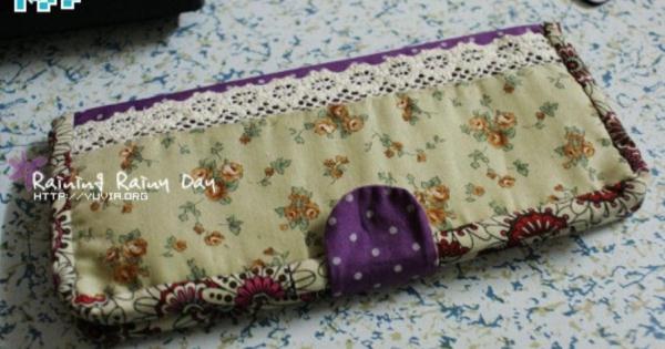 1、裡布19×18(同規格粘合襯、鋪棉各一)2、表布拚布1(紫色水玉)19×9、拚布2(黃底碎花布)19×6、拚布3(紫紅花布)11×3、拚布4(本色麻布)8×33、內層卡位1(紫紅花布10×19),內層卡位2(紫色水玉)12×19+14×9 (對折前尺寸),同規格粘合襯各一4、紙幣位(麻布水玉)16×19(對折前尺寸),同規格粘合襯各一5、零錢包(總尺寸14×19,對折前尺寸) 短布5×19,長布8×19,預留拉鍊寬度1cm,同規格粘合襯各一
