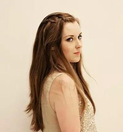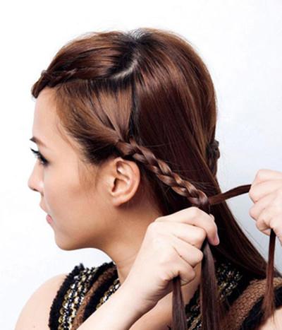 第二步:編好右側的劉海之後,取出左側的劉海也按照三股辮編發,此時編發不用加入新的發束,因為短劉海已經編入右側頭髮中,左側的頭髮一般較長。
