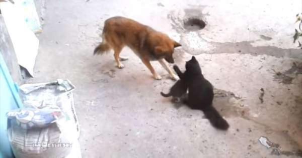 貓咪和狗狗註定是天敵,因為貓咪和狗狗的肢體語言完全是相反的。狗狗歡快的搖尾巴表示友好,在貓咪看來卻是在威嚇牠,所以這兩個物種之間如果存在友誼就太讓人不可思議啦!下面這隻貓媽媽居然不湊巧的碰到了一隻狗狗,真讓人為牠捏一把汗啊…