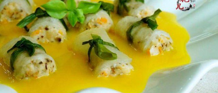 8、蝦糜卷的製作和蒸好的時間,基本就是20分鐘。這個時間,南瓜濃湯也做好了。