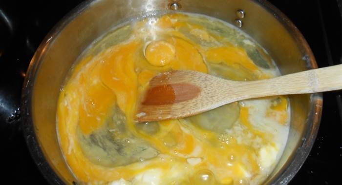 打蛋時,要用筷子慢慢攪拌,如太用力,蛋汁起泡會失去原有的彈性。蛋汁倒入鍋內,不要急著攪動,若蛋汁煮開冒泡。用筷子把氣泡戳破,以除去裏面得空氣,否則蛋會變硬,用這種方法炒出來的蛋細膩柔滑。