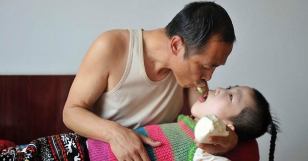 ▼這是拍攝於陝西夫婦家中的照片,照片中腦癱女兒的養父正在給她餵飯,這樣艱難的餵飯生活已經持續了15年。
