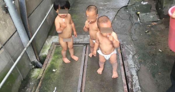 其中最大的女孩沒有穿衣服,另外兩個更小的孩子只穿著尿片,3個粉嫩圓潤的寶寶非常可愛。