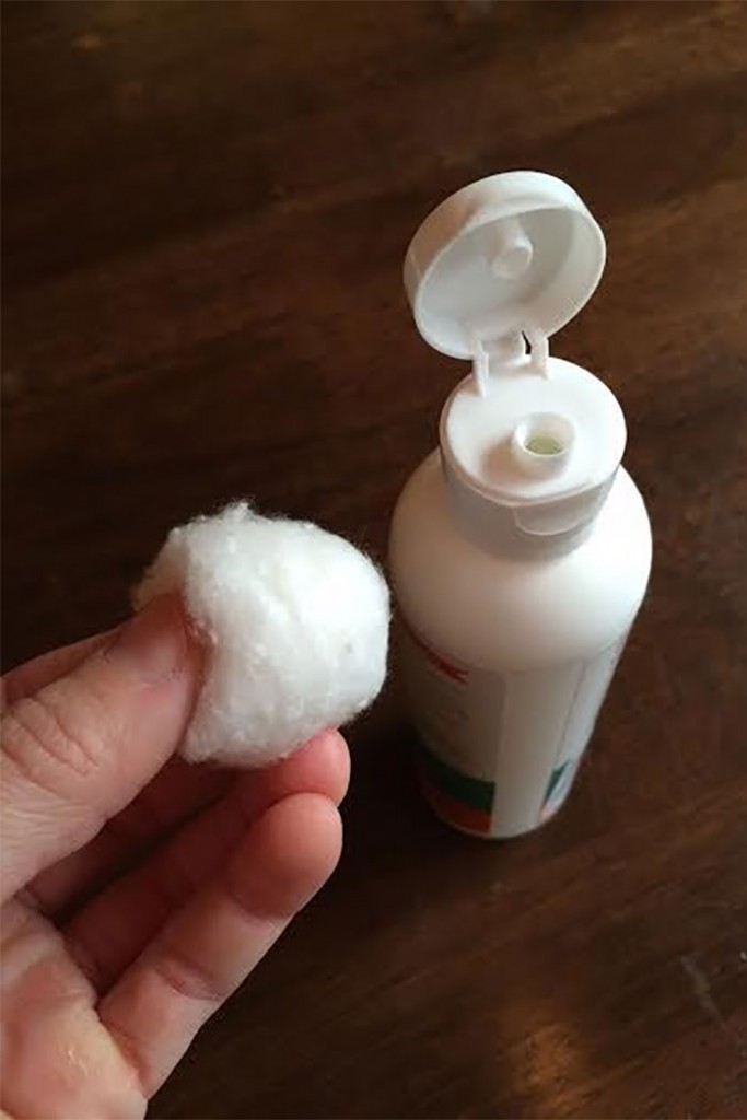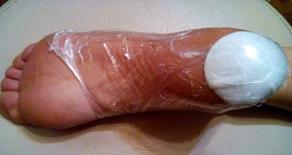 接著把化妝棉或球浸在混合液裡,然後放在你龜裂的部位,為了睡覺時固定綿球的位置,你可以用保鮮膜把棉球綁在你腳上。