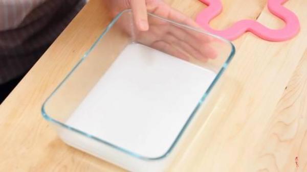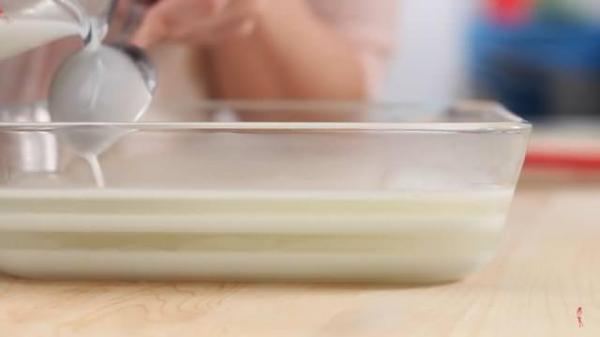 找一個玻璃飯盒,先倒入白色部分的第一份,放在冰箱冷藏5分鐘,基本上凝固了之後拿出來