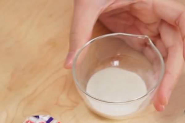 用杯子稱量,把有椰漿的白色部分分成三份,透明部分分成兩份。