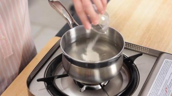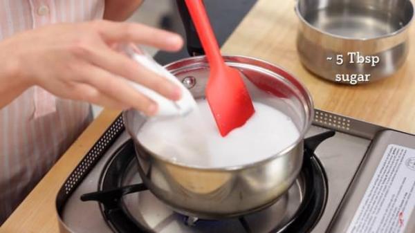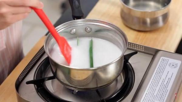 加入15g細砂糖和一截香蘭葉,加熱至砂糖融化,椰汁沸騰