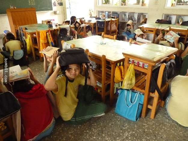 ▼那時候很常有「空襲警報」的演習。大家都會拿東西擋在頭上,然後躲在教室中。
