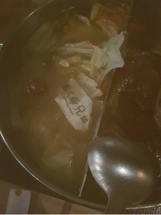 有網友在爆料公社控訴,日前到大師兄火鍋店用餐時,竟然從鍋底撈出餐巾紙,氣得她當場拍照存證。