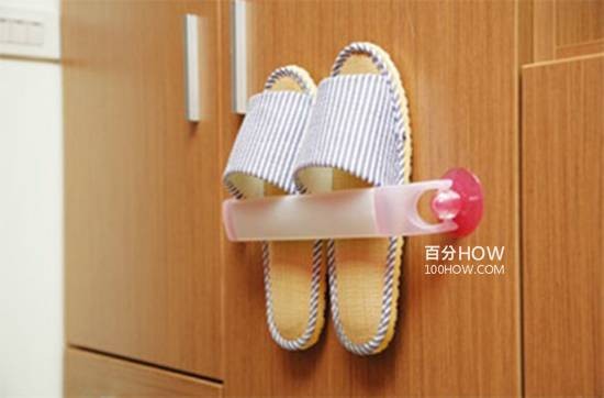 如果在鞋櫃的門板上吸附一個或者幾個這樣的吸盤式毛巾架,進門出門時,拖鞋就可以插在上面,十分節約空間。