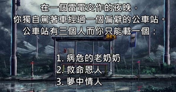 在一個雷電交作的夜晚,你獨自駕著車經過一個偏僻的公車站。