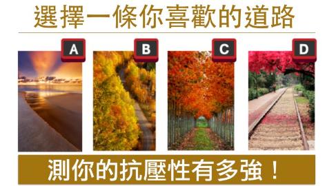 B、你的心理素質很強韌,你喜歡挑戰、喜歡一切刺激、冒險、充滿不確定性的事物,你是一個跌倒後能夠迅速爬起來的人,你穀底反彈的能量總是非常驚人,是屬於越挫越勇的類型!C、你表面上很堅強,在人群面前總是很開朗、總是在微笑、實際上卻剛好相反。