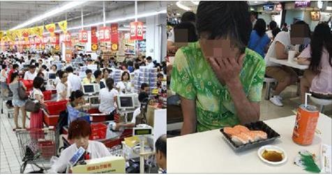 李姓女子問她:「有東西吃嗎?」,阿嬤只是搖頭沒有說話,女子卻立刻跑去買了一盒握壽司給她,阿嬤邊吃邊掉下眼淚,原來自己的家人都過世了,孤單的她在大賣場看到了有許多的家庭在一起開心地吃飯,觸景生情的她,不免悲從中來。