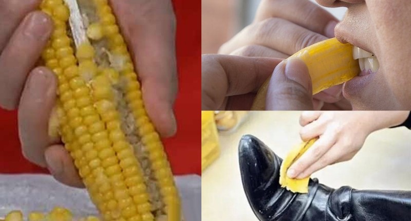用叉子或筷子的斜面端,沿著玉米的紋路,從玉米根部往上推,就能很輕鬆地把玉米粒取下來。