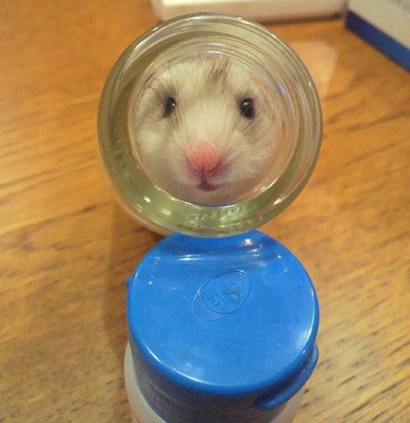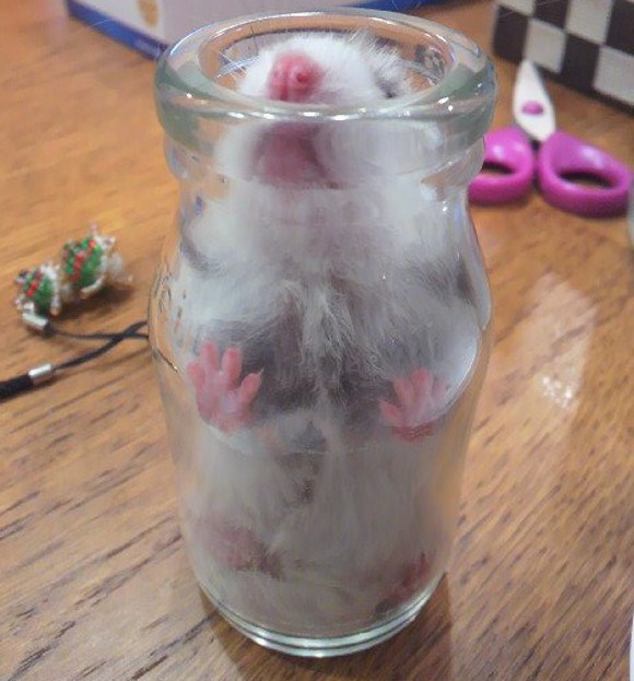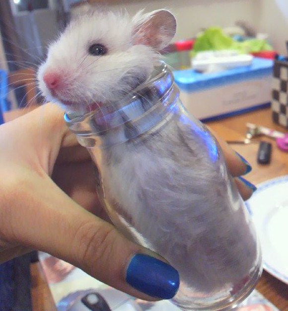 在確認倉鼠沒事之後,她覺得這實在太可愛了,於是就拍了好幾張「瓶中鼠」的照片。