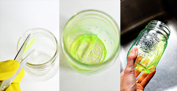 凹折螢光棒後,在罐內剪開,讓螢光劑流出,但是要注意會有狀似玻璃的物體也會一起流出來,事後再把它夾出丟棄即可。也可以試著混色。