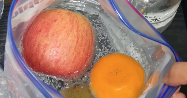 將水果清洗乾淨,帶皮放進收納袋中,如果是柳橙這種外皮比較厚的水果,也可以去皮;