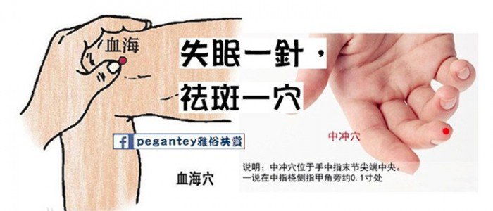 每天堅持點揉兩側血海3分鐘,力量不宜太大,能感到穴位處有酸脹感即可,能使面部皮膚潤澤,可祛除臉上的雀斑及色素沈著。
