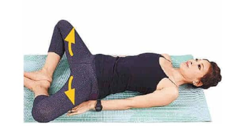 睡前做扭轉動作,建議可直接平躺地進行,在扭轉過程中可伸展頸椎、後背、側腰肌群,此時深呼吸有助暢通呼吸道,助身體進入休息狀態。