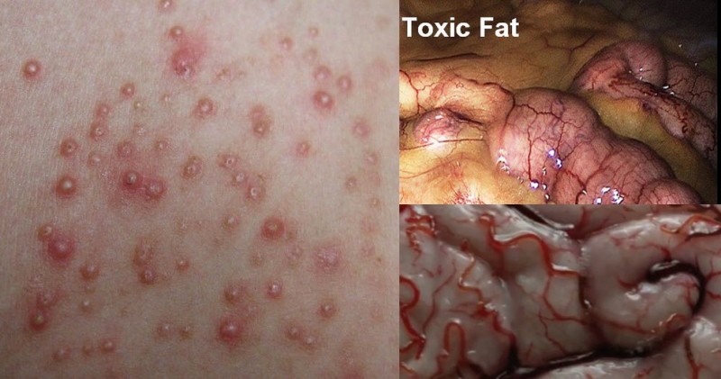 主要表現為:初期沒有自覺症狀,出現黃色瘤(淡黃色的脂肪腫塊)時可能已發展成為重症。如果長期積累不清除,會引起動脈硬化,心膠痛,心肌梗塞,腦梗塞,血栓閉塞性脈管炎,膽結石。
