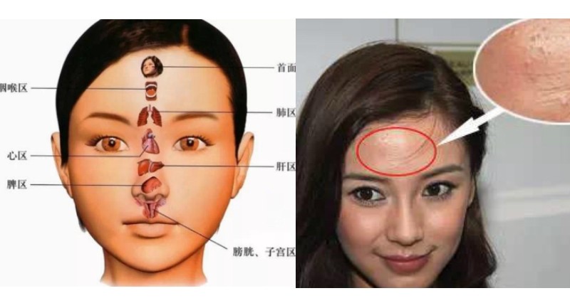 在額上1/3至髮際處一圈,此處出現暗瘡痘或白點膿包或和面部額色不一樣,說明女性氣血運行不暢通,肺熱雍盛,也代表此時心理壓力比較重。若出現斑,更要小心心臟疾病。