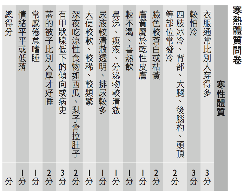 *寒性體質總得分較高者,為寒性體質;熱性體質總得分較高者,為熱性體質。無法決定的題目可以棄權不 答,不列入計分。寒性與熱性兩邊總得分相差小於三者為「平性體質」或「寒熱錯雜體質」。