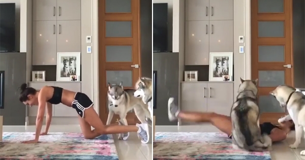 哈士奇是世界上最聰明、最可愛的狗狗之一。但發現主人獨自活動忽略自己時,牠們的反應和其他狗狗沒有什麼差別。澳洲健身女神Kayla Itsines家中就有兩隻粘人的哈士奇,每次她做運動,狗狗們就跑過來搗亂。如果她不理不睬,狗狗們就坐在地上嚎叫耍賴,場面非常有趣。