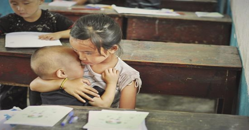 這是一對農村小姐弟:一個約莫七八歲的小姑娘,懷抱著一個大約一兩歲的小孩,背景則是正在上課的小學課堂。配圖文字是「因為小弟弟鬧困,正在聽課的姐姐急忙抱起他」。這張圖,瞬間感染無數網友,還有人試圖對口資助女童。該圖攝於湖南鳳凰縣山江鎮一小學。