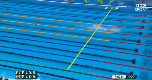 奧運就是一群快、高、強的人在追求更快、更高、更強。今年19歲的Katie Ledecky是美國遊泳隊的成員,2012年時,年紀輕輕的她就拿下800公尺自由式金牌,並創下世界紀錄。這次裏約奧運會中,她的成績又有所提高。比賽前大家就知道她能力出眾,沒想到這次她竟然比亞軍快了將近12秒,鏡頭轉到她時,就好像泳池中只有她一個人在比賽。