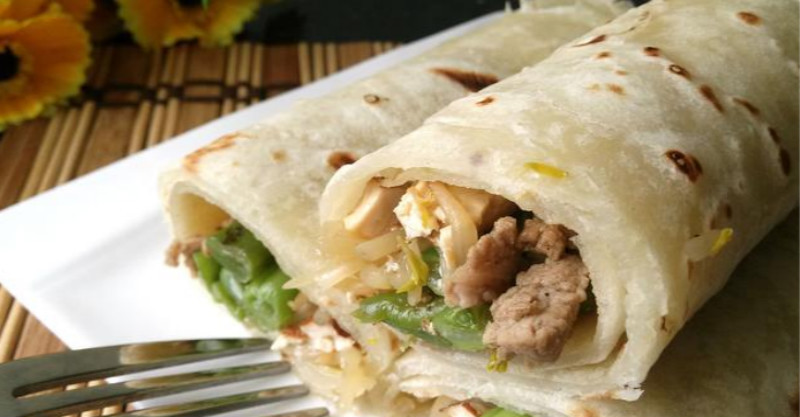 這個餅的材料超級簡單,就只有面粉和水,薄薄地做鍋裏抹一層面糊,就是一張薄餅,然後,炒一些你喜歡的蔬菜,捲起來,就可以吃了。咬一口,滿滿的餡料,大大地滿足啊!