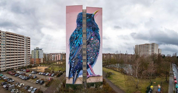 很多城市都有用於壁畫設計和觀賞的特定區域,最近,荷蘭藝術家Super A和 Collin van der Sluijs合作,在柏林一棟公寓的外牆上畫了一幅名為「Starling」的美麗壁畫。該壁畫佔滿整個牆壁,高41.7米,遠觀是一隻藍、紫色的大鳥,但放大一看還有別出心裁的設計。