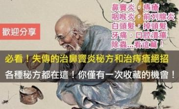 失傳的治鼻竇炎秘方和治痔瘡絕招,各種秘方都在這! 觀看人數:109