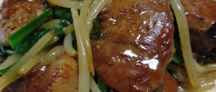 ③在同個平底鍋內加進更多的油切成丁的洋蔥和薑片還有韮菜、豆芽菜全部一起拌炒②煎熟的豬肝放進來。