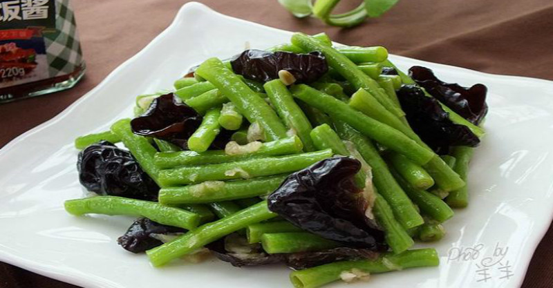 【材料】長豆角、黑木耳、大蒜,鹽,雞精、醋、香油適量。
