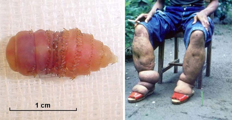 6. 蛔蟲。蛔蟲通常是藉由蚊蟲叮咬找到寄主,一旦讓他進入到你體內,他可以活到8年,並且整個破壞你的淋巴係統,還會害你的四肢腫脹就如下圖。