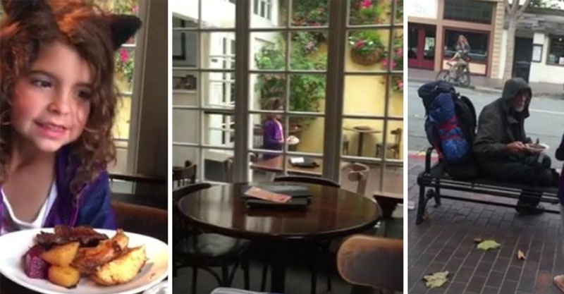 小女孩看著外面的流浪漢感到很不舒服,所以直接把自己的晚餐「端了出去」…