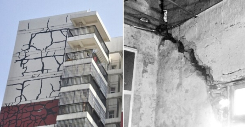 發現柱、樑、牆、版有嚴重龜裂之建築物。