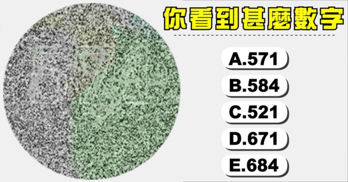 你看到的是什麼數字呢? A.571 B.584 C.521 D.671 E.684 憑第一感覺選擇了才拉下去看答案哦! - - - - - - - - A. 571 你是一個不喜歡計較的人,心思敏感細膩,腦袋轉得很快,喜歡和樂不喜歡爭吵,總是願意站在別人的角度看事情,習慣默默付出,無私的貢獻,心機與你沾不上邊,這樣的你讓你獲得了讚許以及別人的信賴感,但是要很小心身邊總有著想扯你後腿的人,並利用你的善良達成他的目的,你是一個善良的人,朋友眼中熱情又帶點酷的小傻呆,可要先好好愛自己,眼睛睜大一點,別被騙了啊。