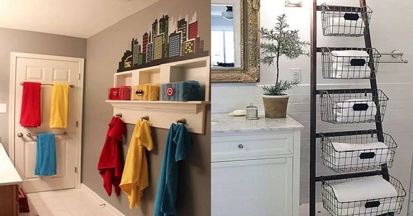 ▼而對於比較佔地方的浴巾,如果家中浴室沒有專門的收納櫃,可以把收納筐掛在梯子上~
