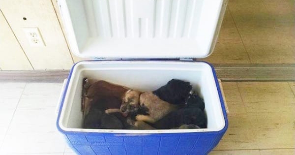 ▼一名不知名的德州女駕駛在開車時,看到下方圖中的小冰箱,就在她準備將冰箱帶回家使用時,打開蓋子一檢查,裡頭竟然躺著9隻嗷嗷待哺的德國牧羊犬幼犬。