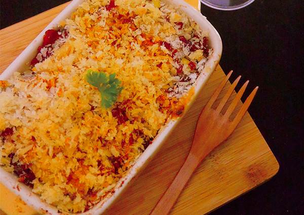 6. 陶瓷烤盤輕刷一層油,將馬鈴薯片、雞蛋、培根交錯相疊。當中間隔倒入酸奶油糊。最後撒上面包粉、匈牙利辣椒粉。