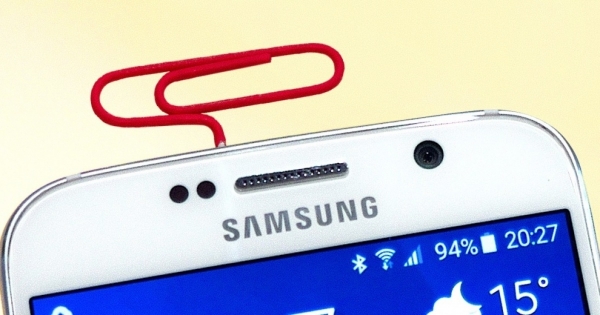 ▼20.沒有工具時打開SIM卡槽:找一個迴紋針,插入小孔後輕鬆打開卡槽。