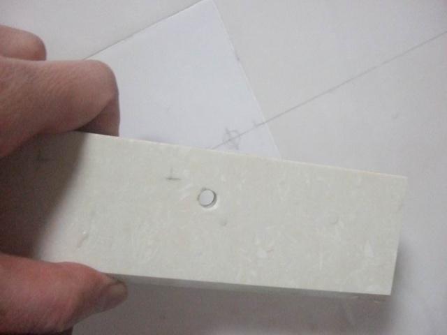 為了使洞的位置打得準確點,可以先在瓷磚斜著打個小坑定位。師傅教我用一小塊不用的瓷磚先在上麵打個孔,然後對準原先畫好位的瓷磚打會更好。