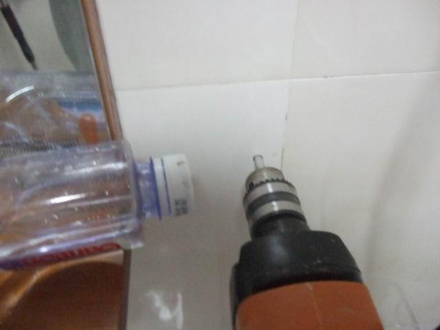 打出個小洞後就可以把那一小塊瓷磚拿掉,拿掉後繼續打。為了防止瓷磚幹打開裂,找個水瓶在蓋子上打個孔,一隻手拿水瓶,一隻手拿鑽子,一邊打一邊噴水把瓷磚弄濕,如果你家用的是全是瓷磚就必須要讓瓷磚吸水,否則的話準會把瓷磚打碎。