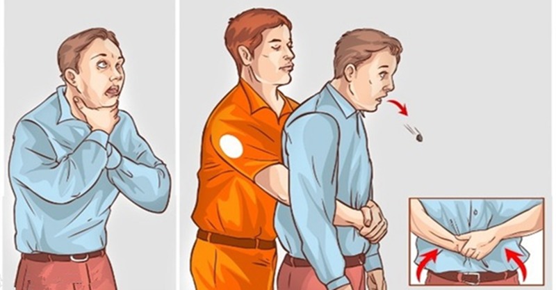 急救者站在被噎者後方,用手握拳向橫膈膜(肚臍上方)施壓,就像是要從背後把對方抱起一樣,這樣做就會壓縮肺部好將異物排出氣管,沒人幫忙也可以用這招自己自救。
