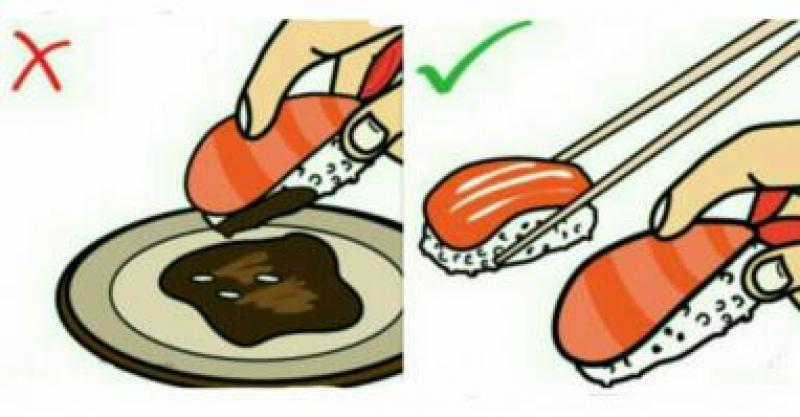 吃壽司沾醬油才入味啊!但是可不能用「飯」的那一麵沾,因為飯會吸收水份而變得很難夾,正確來說應該用「肉」的那一麵沾才對。